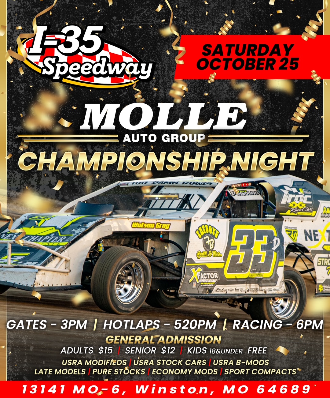 I-35 Speedway Race Recap 10-25-25Saturday, October 25th was Molle Auto Group Championship Night at I-35 Speedway. The points championships were locked up before the end of the night, but there was still plenty of action to be seen on track.
