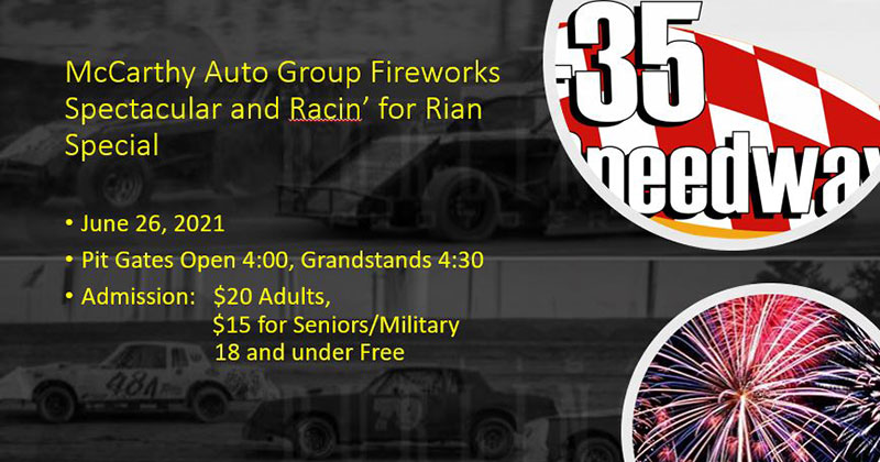Fireworks, Racin' for Rian this Saturday at I-35 SpeedwayOooh, Awe, Wow, Yeah, Yippee, more Ooohs, that is how the racing this Saturday, June 26, will end at I-35 Speedway. How do we know this already? It is the McCarthy Autogroup Fireworks Spectacular Racin’ For Rian Special. In addition to the magnificent ra …