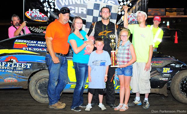 USRA Modifieds would take to the track and prove again the best of the best race at I-35 Speedway. Heat race winner and 2014 track champion Zach Sanders #69 would take the early lead and never relinquish the top spot. Another dedication in victory lane as new father Zach Sanders would celebrate with new daughter Bailey. Sanders would be challenged throughout the feature by other heat race winner Robbie Reed #5. Reed would recover from a lap one miscue and race back to place second. Point leader Dennis Elliott #29 would race side by side with Ryan Schaffer #R21 to the checkers with Elliott third and Schaffer fourth. Shayne Bailey #5d would again be among the front runners and place fifth on the night.