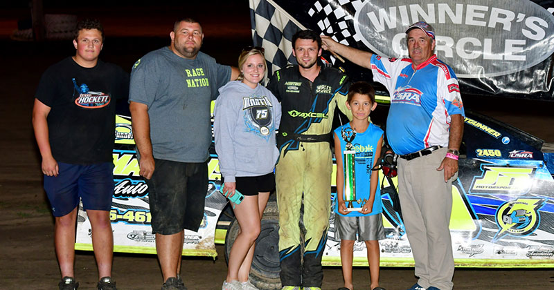 In the USRA Modifieds, the night started with Gunner Martin, Austin Johnson and Tyler Hibner picking up heat race wins. In the feature, Martin rimmed the cushion all night long on his way to a convincing victory on Earley Tractor Night.