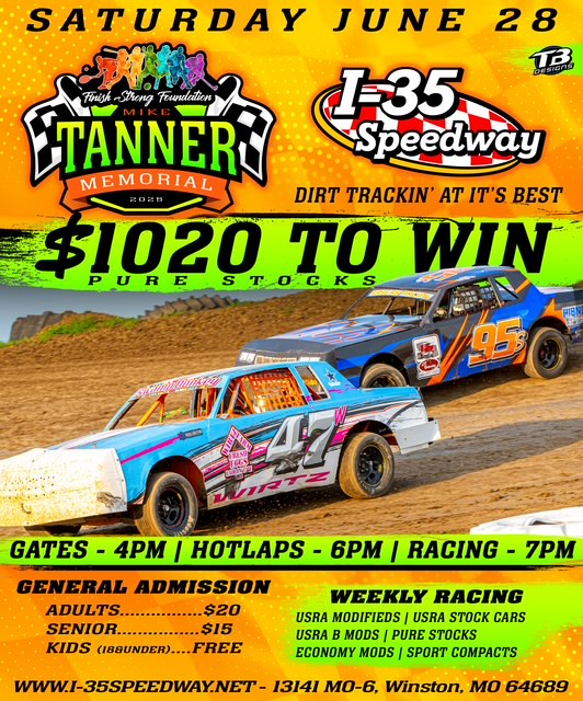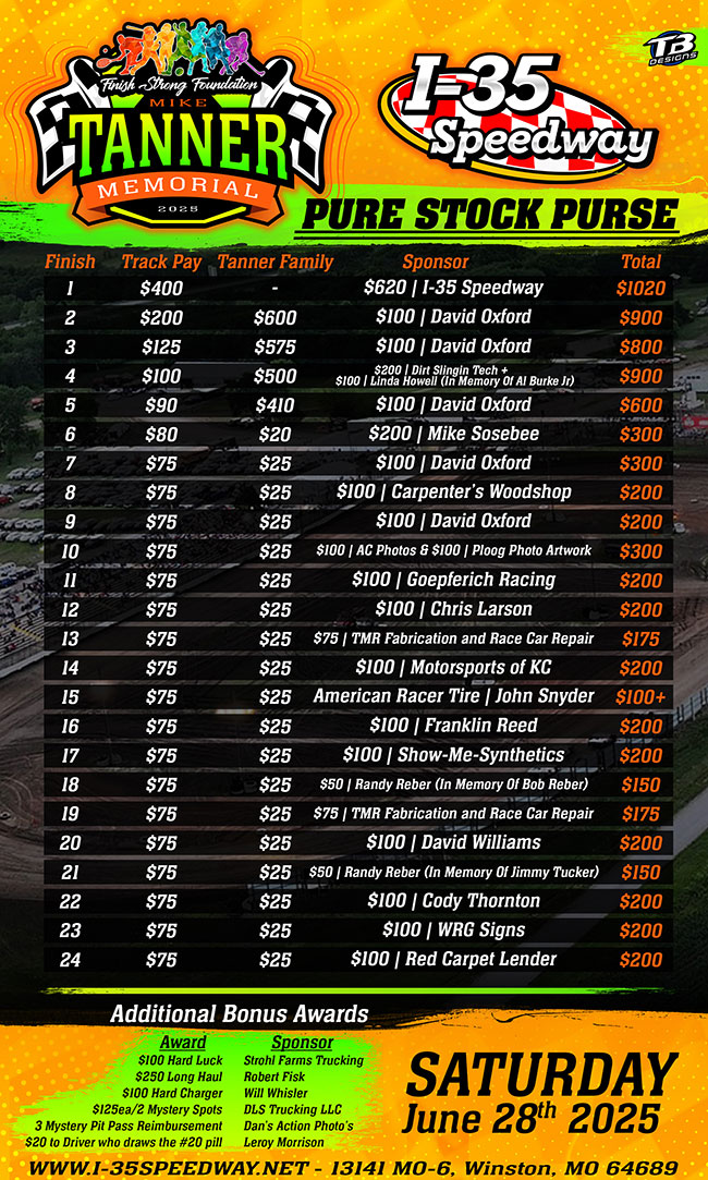 Join us for the Tanner Memorial feature race in the Pure Stock class, with $1,020 to win. See the attached payout sheet from the Tanner Family. I-35 Speedway thanks the Tanner family for their support.