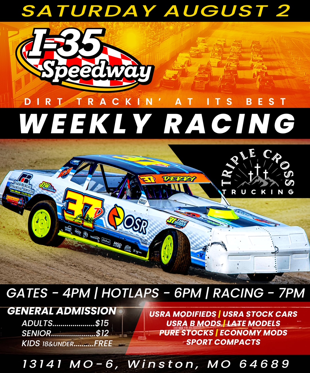 Triple Cross Trucking Night at the Races is this Saturday, August 2, 2025, at I-35 Speedway. Join us to see the USRA Modifieds, USRA Stock Cars, USRA B Mods, Late Models, Pure Stocks, Sport Compacts (including juniors), and E Mods, in competition on the legendary speedway.
